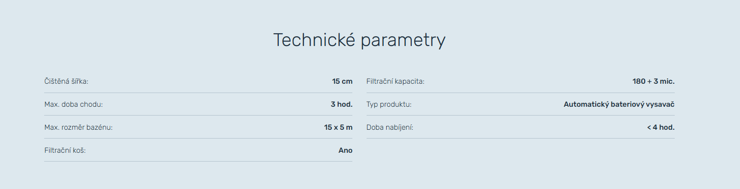 Automatický bateriový vysavač Zodiac, Max. rozměr bazénu: 15 x 5 m, Filtrační kapacita: 180 + 3 mic.