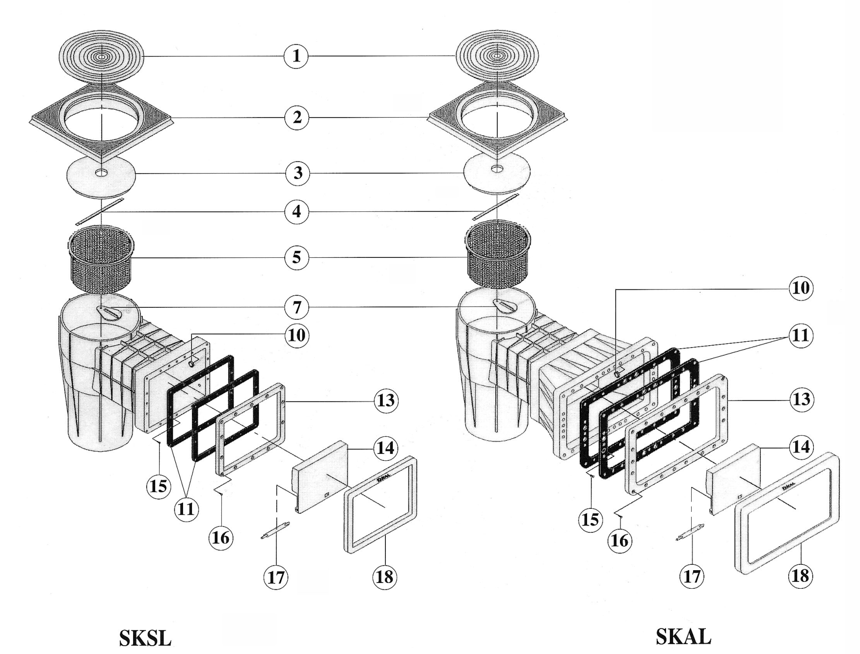 Katalog náhradních dílů podle schématu pro Skimmer Kripsol sání 200 mm x 180 mm.