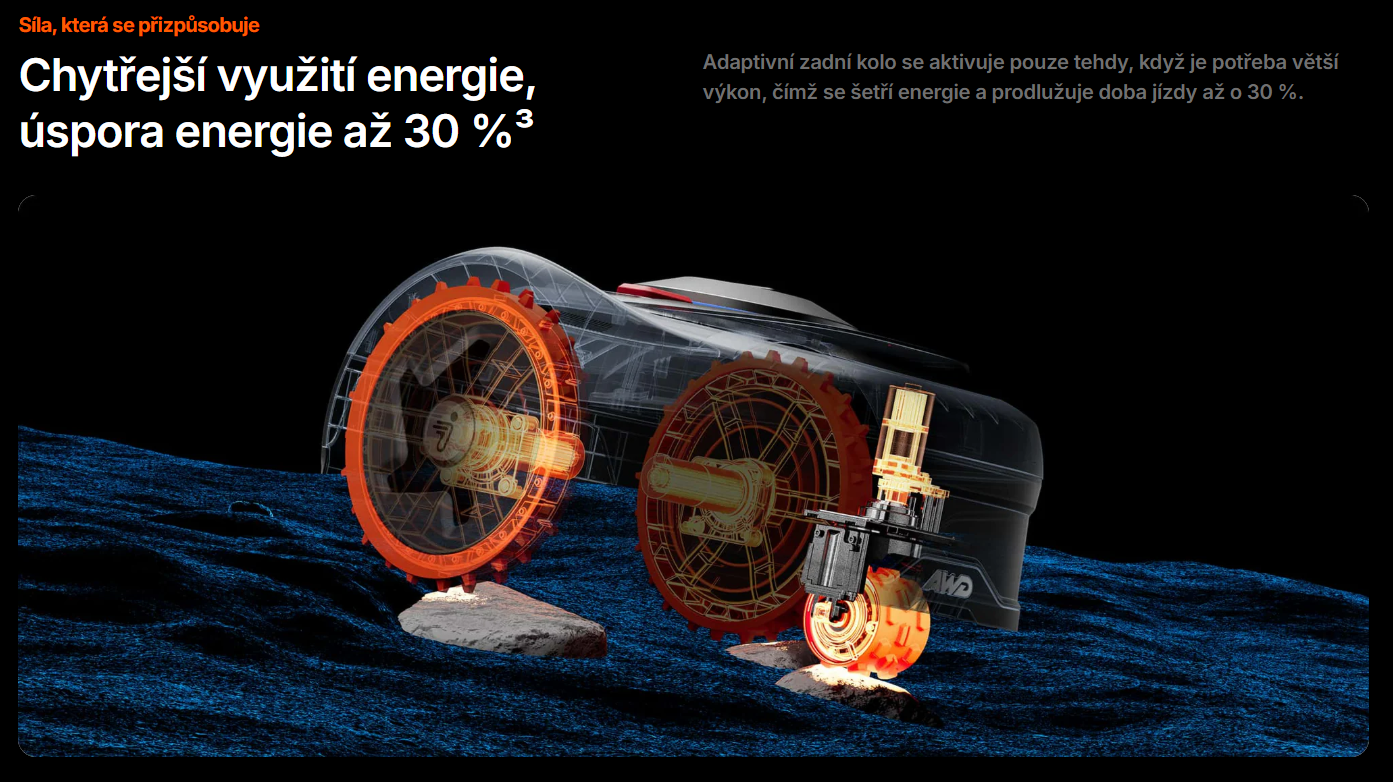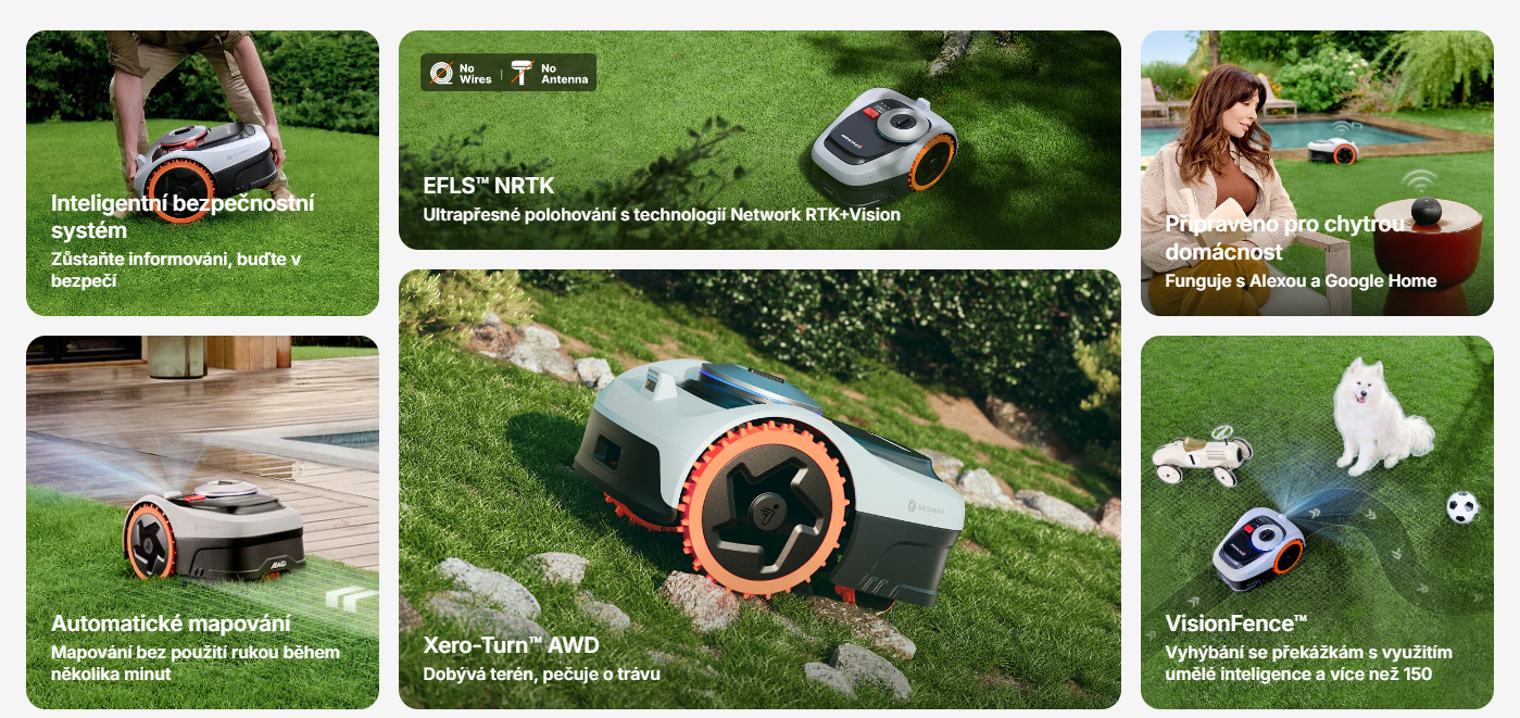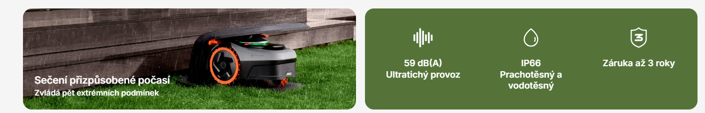 Hlavní výhodou tohoto modelu je AWD pohon, díky kterému si sekačka s jistotou poradí se složitějším terénem, nerovnostmi i svahovitými zahradami, kde běžné robotické sekačky často ztrácí trakci. O bezpečné a plynulé sečení se postará VisionFence kamera se záběrem 140°, která pomáhá spolehlivě rozpoznávat překážky před sekačkou a vyhýbat se jim.