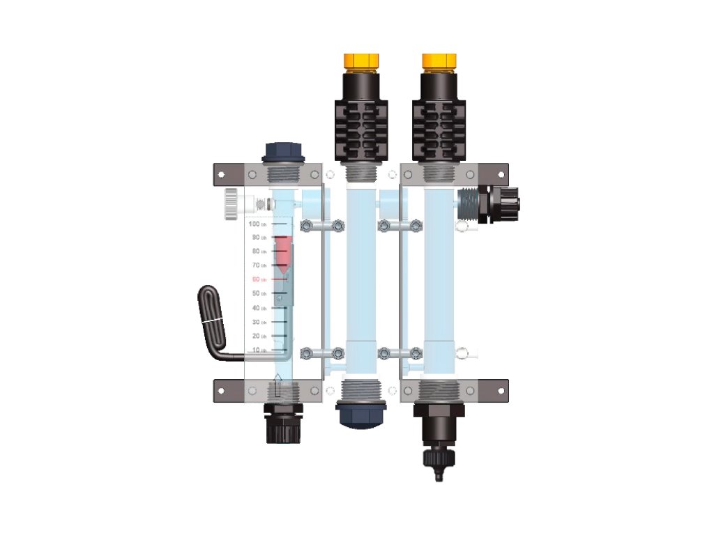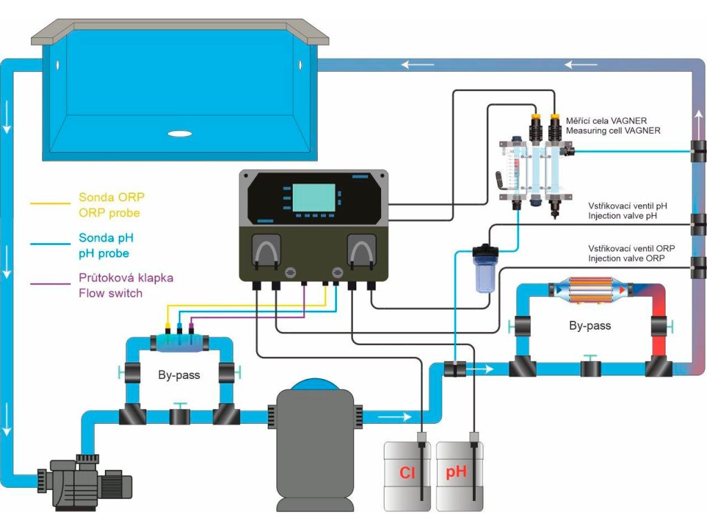 VA DOS EXACT "VAGNER" pH + FCL Digitální víceparametrová dávkovací stanice pro péči o bazénovou vodu Měřené hodnoty se zobrazují na velkém přehledném grafickém displeji Stupeň krytí IP65 Provozní ochrany: OFA alarm (OverFeedAlarm - ochrana proti předávkování) Galvanicky oddělné vstupy měření Hlídání průtoku - není součástí balení Hlídání hladiny chemických činiděl - není součástí balení Způsob dávkování: ZAP/VYP Časové (5-3600s) Proporcionální (na základě naměřených hodnot) Snadno nastavitelná multiparametrová stanice Menu v několika světových jazycích (CZ, EN, DE, HR, RU ... ) Stanice má integrovanou Wi-Fi a lze ji vzdáleně ovládat pomocí aplikací "SEKOlink" či "SEKOweb" Kompatibilní s inteligentním ovládáním VArio (Verze 1.4 a vyšší) Přímé měření koncentrace volného chlóru (0 - 5 ppm) Dávkování chlorové dezinfekce Měření pH v bazénové vodě (rozsah měření: 0,0 - 14,0) Dávkování pH (pH plus / pH mínus) Stanice je osazena dvěma peristaltickými čerpadly s průtokem až 1,5 l/h Stanici je možné rozšířit o dávkování flokulantu, a to tak, že se ke stanici přidá externí dávkovací čerpadlo Lze připojit a ovládat základní jednotku pro úpravu slané vody (solničku bez měření) Stanici lze rozšířit např. o: měření průtoku, dávkování flokulantu, ... Součástí balení stanice VA DOSEXACT "VAGNER" pH + FCL je i příslušenství pro měření a regulaci pH a FCL Příslušenství pro měření a regulaci pH [2x navrtávací díl, pH sonda, držák sondy, kalibrační roztoky (4/7), vstřikovací ventilek, redukce pro vstřikovací ventilek] MĚŘÍCÍ CELA "VAGNER" obsahuje volnochlórovou sondu v měděnoplatinovém provedení s vyšší odolností (měď není v kontaktu s vodou) Schematický příklad hydraulického zapojení stanice VA DOS BASIC EXACT "VAGNER" - pH + FCL Možnosti rozšíření: Průtokový senzor Hladinová sonda VA DATALOG KIT ORP s PT sondoU VArio Teplotní senzorDoplňkové parametry