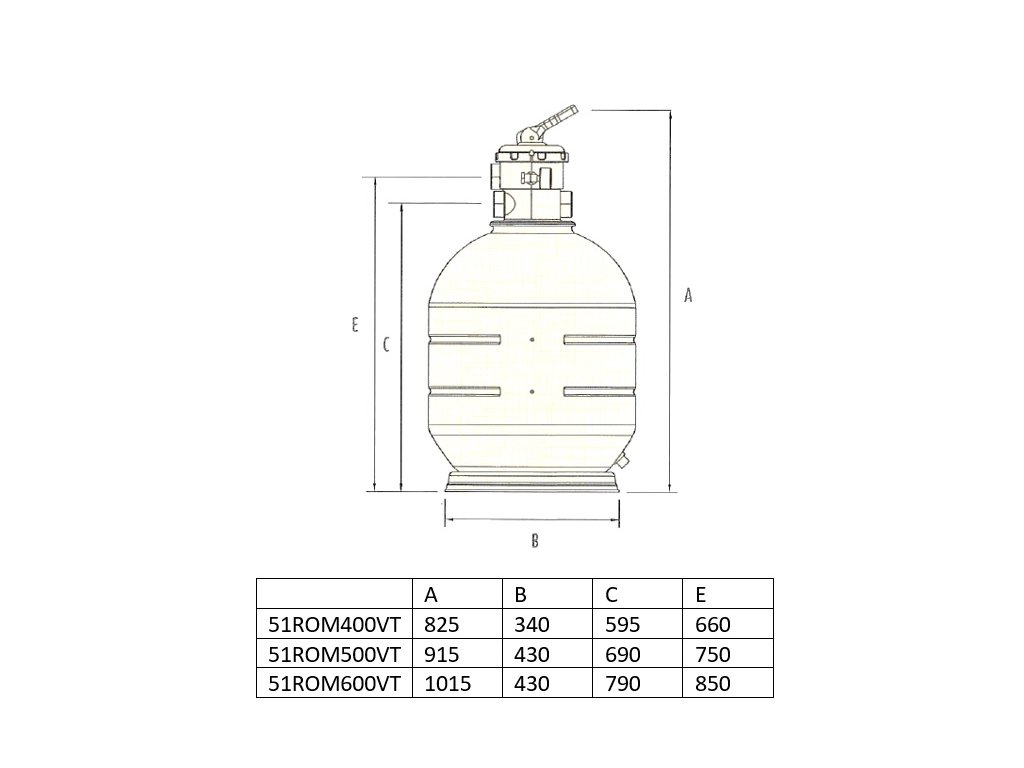 Roma -Filterbehälter bestehen aus einem gleichmäßigen Körper von Polythyne mit hoher Dichte. Das 6-Wege-Ventil befindet sich auf der Oberseite des Behälters und ist mit einem Manometer ausgestattet. & Nbsp;Zusätzliche Parameter