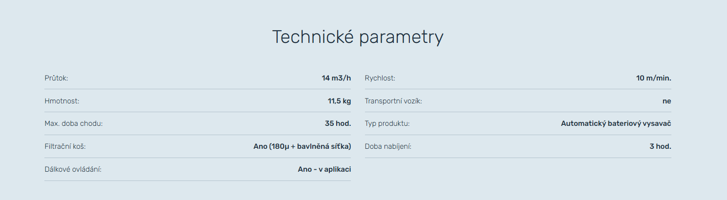 do které se automaticky vrátí při poklesu baterie pod 20 %. Technická data Schopnost čistit všechny typy dna a všechny tvary bazénu 7 čistících módů: pouze dno pouze stěny pouze hladinová linka Nejdříve stěny