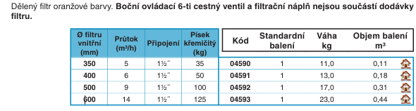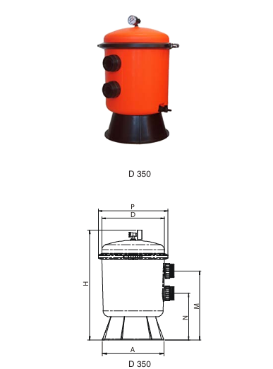 Dělený filtr filtr BILBAO D 350 oranžové barvy, středové uzavření filtru pomocí nově profilované ocelové skruže natřené černou barvou, okraje obou částí filtru zesíleny, manometr, vypouštěcí a odvzdušňovací ventilek. Maximální doporučená filtrační rychlost 50 m³/h/m². Maximální tlak 1,5 kg/cm².