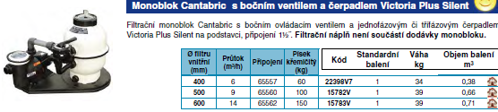 Kompletní filtrační monoblok Cantabric s bočním ovládacím ventilem a jednofázovým čerpadlem Victoria Plus Silent na podstavci, připojení 1½"". CANTABRIC - plastový filtr barvy slonové kosti pro soukromé bazény. Horní a dolní část filtru polyfúzně svařena, čímž je zaručena nejvyšší tlaková odolnost . Nádoba je vybavena manometrem, ručním odvzdušňovacím ventilkem, výpustí vody a písku. Horní průhledné víko z PVC upevněno k filtru plastovou převlečnou matkou. Maximální doporučená filtrační rychlost 50 m³g/h/m². Maximální pracovní tlak 2, 5 kg/cm². Balení obsahuje: filtrační nádobu Cantabric 500 jednofázové čerpadlo Victoria Plus Silent 11 m³/h 6 - cestný boční ventil KLASIK 1½ "" propojovací potrubí podstavec