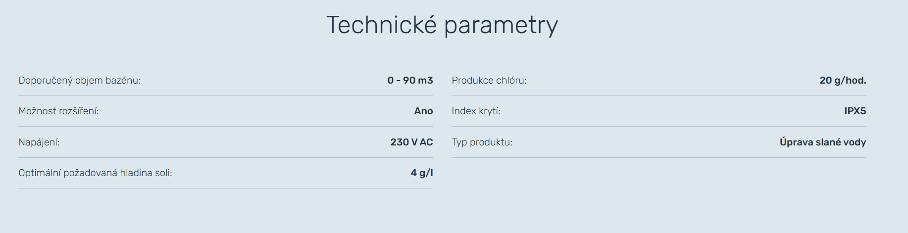 Úprava slané vody, Doporučený objem bazénu: 0 - 90 m3, Produkce chlóru: 20 g/hod., Index krytí: IPX5 , Optimální požadovaná hladina soli: 4 g/l, Možnost rozšíření: Ano, Napájení: 230 V