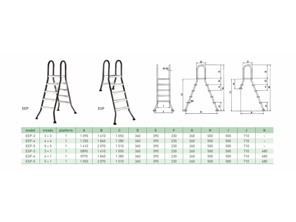 Žebřík je vyroben z nerezové oceli AISI 304 a proto důrazně nedoporučujeme použití u bazénů, kde je k dezinfekci vody použita elektrolýza soli. Více o nerezové oceli naleznete zde : RADY A TIPY k nerezové/korozivzdorné oceli AISI Příslušenství, které zaručuje pohodlný a pohodový vstup do bazénu a výstup z něj. Žebříky jsou určeny pro privátní a komerční bazény. Jsou vyrobeny z leštěné nerez oceli. AISI 304 průměru 43 mm. Stupně jsou doplněny protiskluz. nášlapy. Každý žebřík je zakončen opěrným klubem směrem ke stěně bazénu. Kotvení se dodává s pouzdrem a svorkou pro uzemnění.Doplňkové parametry