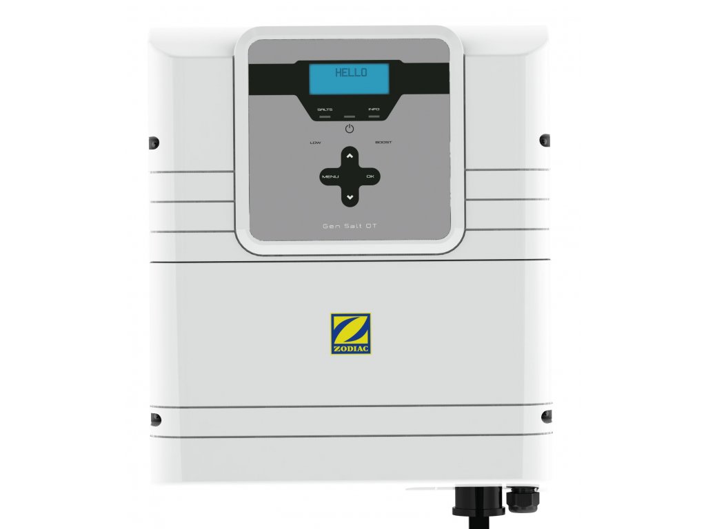 GENSALT OT je systém, který sám o sobě dokáže procentuálně vytvářet chlór (elektrolýza soli) stejně tak jako Ei2 či Ei2 Expert. Jednotku GENSALT OT, ale lze rozšířit o přídavný modul „pH Link“ pH Link umožní regulaci a dávkování pH - 40 m 3 -> minimální filtrační doba 8 h/d Zodiac® GENSALT OT má krytí IP43 a maximální produkcí chlóru 10g/h pro privátní bazény do 40 m 3 Podsvícený 4-řádkový LCD displej Uživatelské prostředí v CZ , SK EN, DE, ... Funkce "BOOST" (výkon 100% - 24h) a funkce "LOW" (výkon 10% - 24h) Průtoková klapka Časovač Nastavení doby produkce chlóru (Lze nastavit 2 časovače) Nastavení pro jendorychlostní čerpadla (2 časovače) Revers polarity každých 5 hodin (lze nastavit od 2h do 8h) Životnost cely: 7 500 hodin Vzdálenost mezi celou a řídící jednotkou = 1,5 m Jednotka by měla být připojena trvale do elektrické sítě (pro správnou funkčnost časovačů) V balení: Zařízení GENSALT OT Cela (Quick Fix) Sada pro montáž na zeď Sada pro detekci průtoku - průtoková klapkaDoplňkové parametry