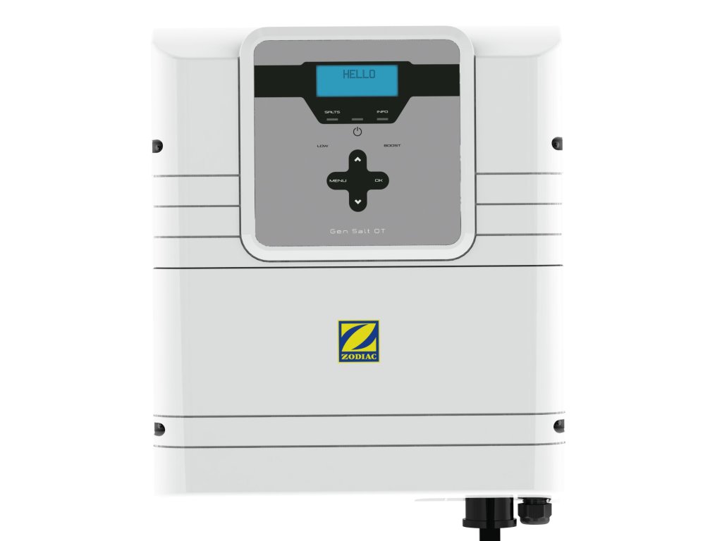 GENSALT OT je systém, který sám o sobě dokáže procentuálně vytvářet chlór (elektrolýza soli) stejně tak jako Ei2 či Ei2 Expert. Jednotku GENSALT OT lze rozšířit o přídavný modul „pH Link“ pH Link umožní regulaci a dávkování pH - 70 m 3 -> minimální filtrační doba 8 h/d Zodiac® GENSALT OT 18 má krytí IP43 a maximální produkcí chlóru 18g/h pro privátní bazény do 70 m 3 Podsvícený 4-řádkový LCD displej Uživatelské prostředí v CZ , SK EN, DE, ... Funkce "BOOST" (výkon 100% - 24h) a funkce "LOW" (výkon 10% - 24h) Průtoková klapka Časovač Nastavení doby produkce chlóru (Lze nastavit 2 časovače) Nastavení pro jendorychlostní čerpadla (2 časovače) Revers polarity každých 5 hodin (lze nastavit od 2h do 8h) Životnost cely: 7 500 hodin Vzdálenost mezi celou a řídící jednotkou = 1,5 m Jednotka by měla být připojena trvale do elektrické sítě (pro správnou funkčnost časovačů) V balení: Zařízení GENSALT OT Cela (Quick Fix) Sada pro montáž na zeď Sada pro detekci průtoku - průtoková klapkaDoplňkové parametry