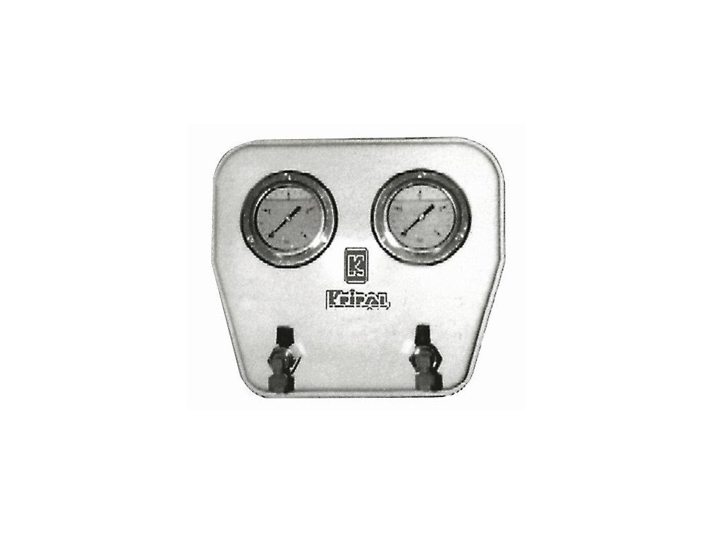 Dvojitý horizontální panel s dvěma glycerinovými manometry usazenými vodorovně na polyesterové základně. Určeno pro měření tlaku ve velkých komerčních filtrech. Připojení : plastovou hadičkou 6/4mm. Vybaveno dvěma odběrnými kohoutky.Doplňkové parametry